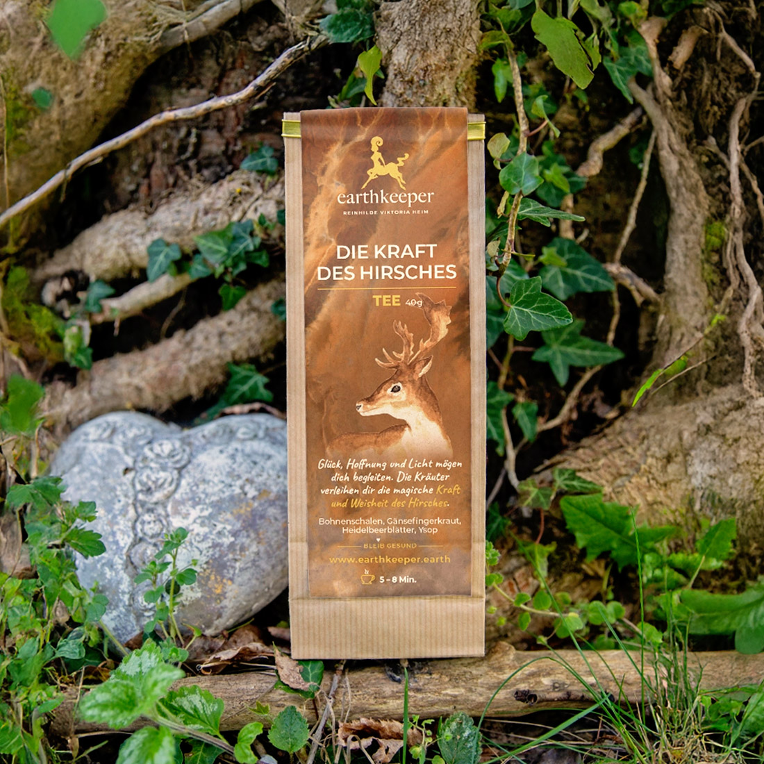 Der Hirsch gilt als Hüter des Waldes – stark, weise und doch voller Sanftmut. Mit dieser Mischung darfst du seiner Spur folgen. Glück, Hoffnung und Licht mögen dich begleiten, wenn du diesen Tee trinkst. Die Kräuter verleihen dir seine magische Kraft: Bohnen­schalen entgiften, Heidel­beer­blätter erinnern an stille Wald­lich­tungen, Ysop schenkt dir Energie, und Gänse­fin­ger­kraut hilft dir, loszu­lassen. Ein Wintertee, der Herz und Seele wärmt.